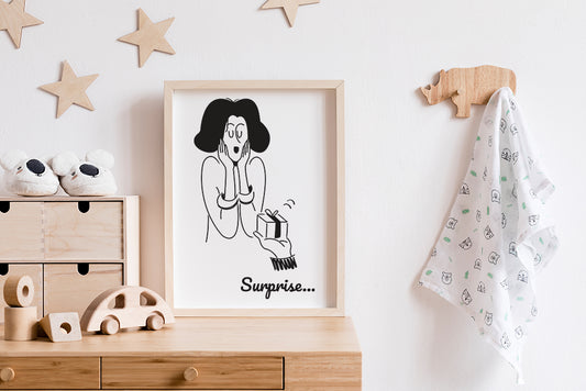 "Surprise..." – Affiche Femme Cadeau Minimaliste Noir et Blanc | A6 · A3 · A4 · Digital
