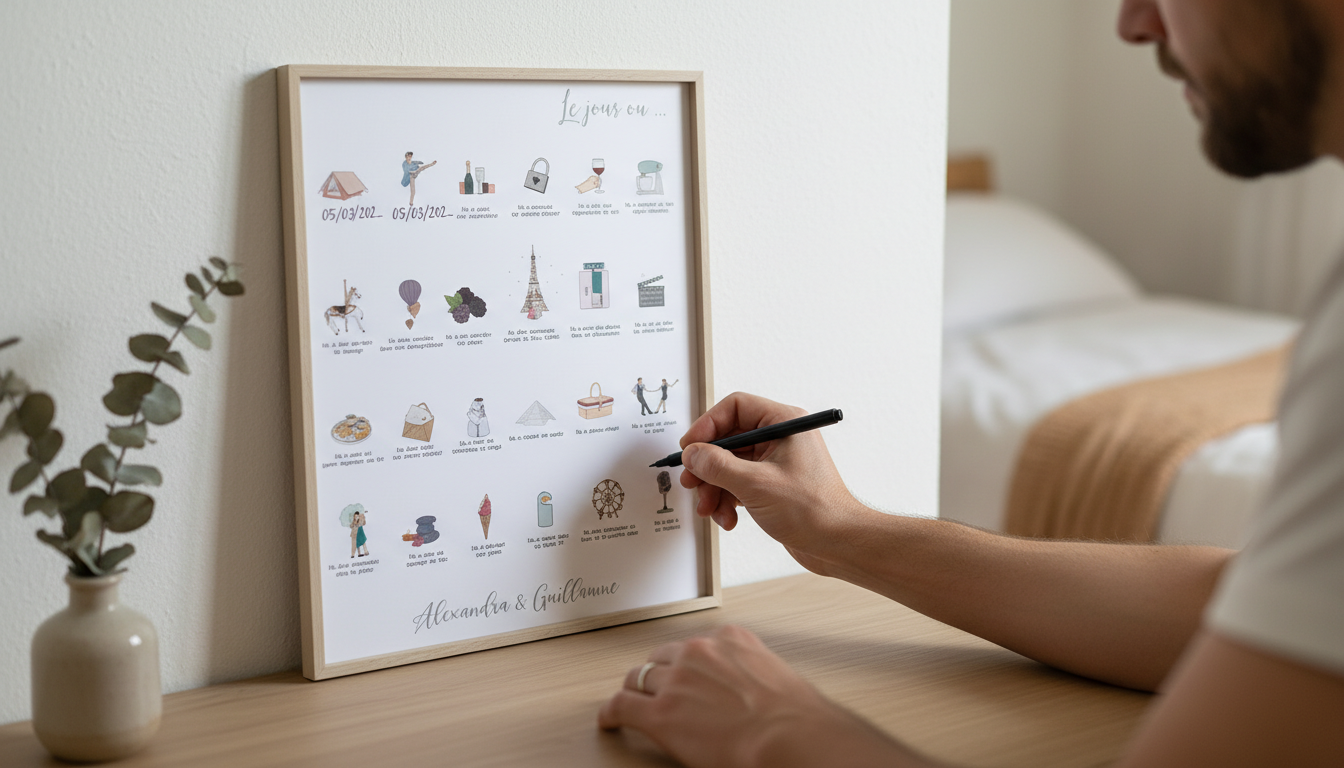 On se dit souvent "il faudrait qu'on fasse ça un jour"... Cette affiche est là pour transformer vos envies en réalité. Conçue comme une "Bucket List" élégante (liste d'envies), elle regroupe une sélection d'activités romantiques, fun ou symboliques à réaliser en duo.