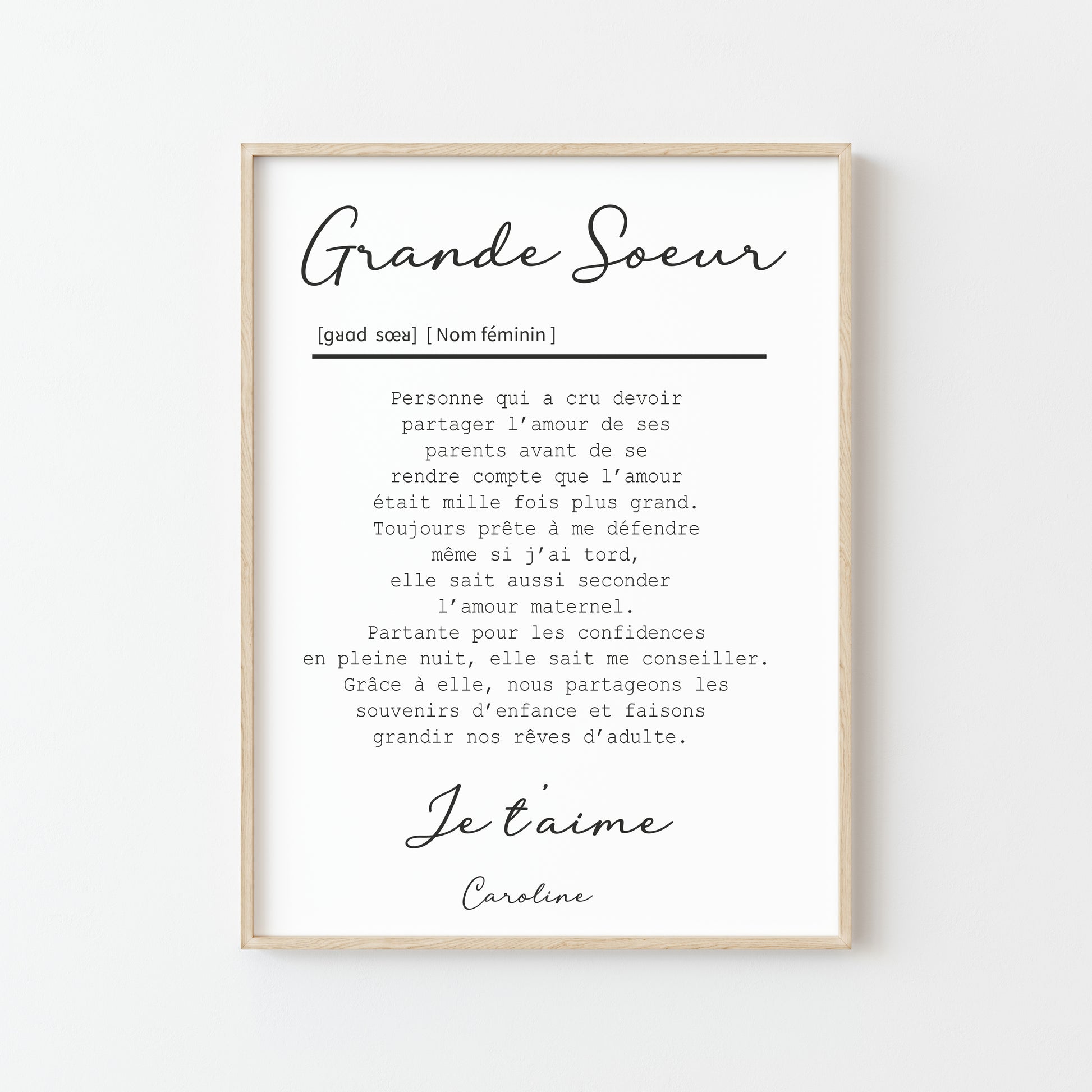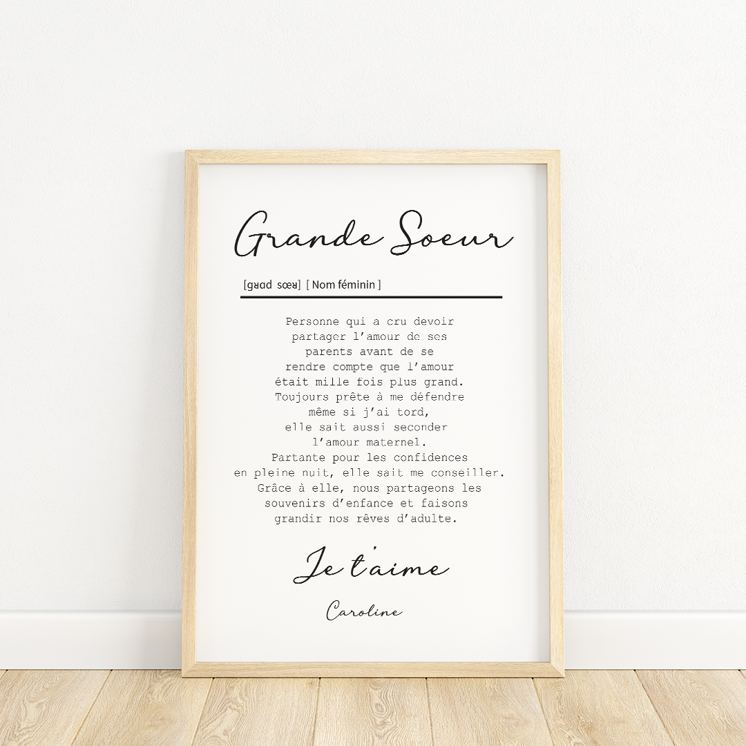 Montrez votre amour et votre admiration pour votre grande sœur avec cette affiche personnalisée. Un cadeau original qui saura la toucher et embellir son espace.