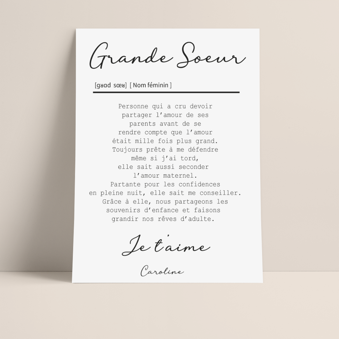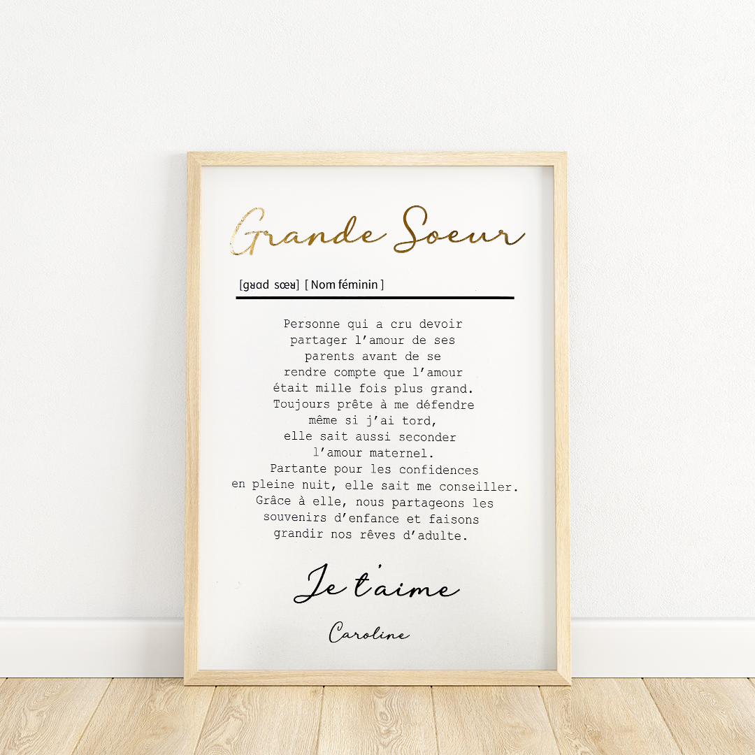 AFFICHE DEFINITION GRANDE SOEUR avec ou sans touche métallisée ( Rose Gold ou Doré)