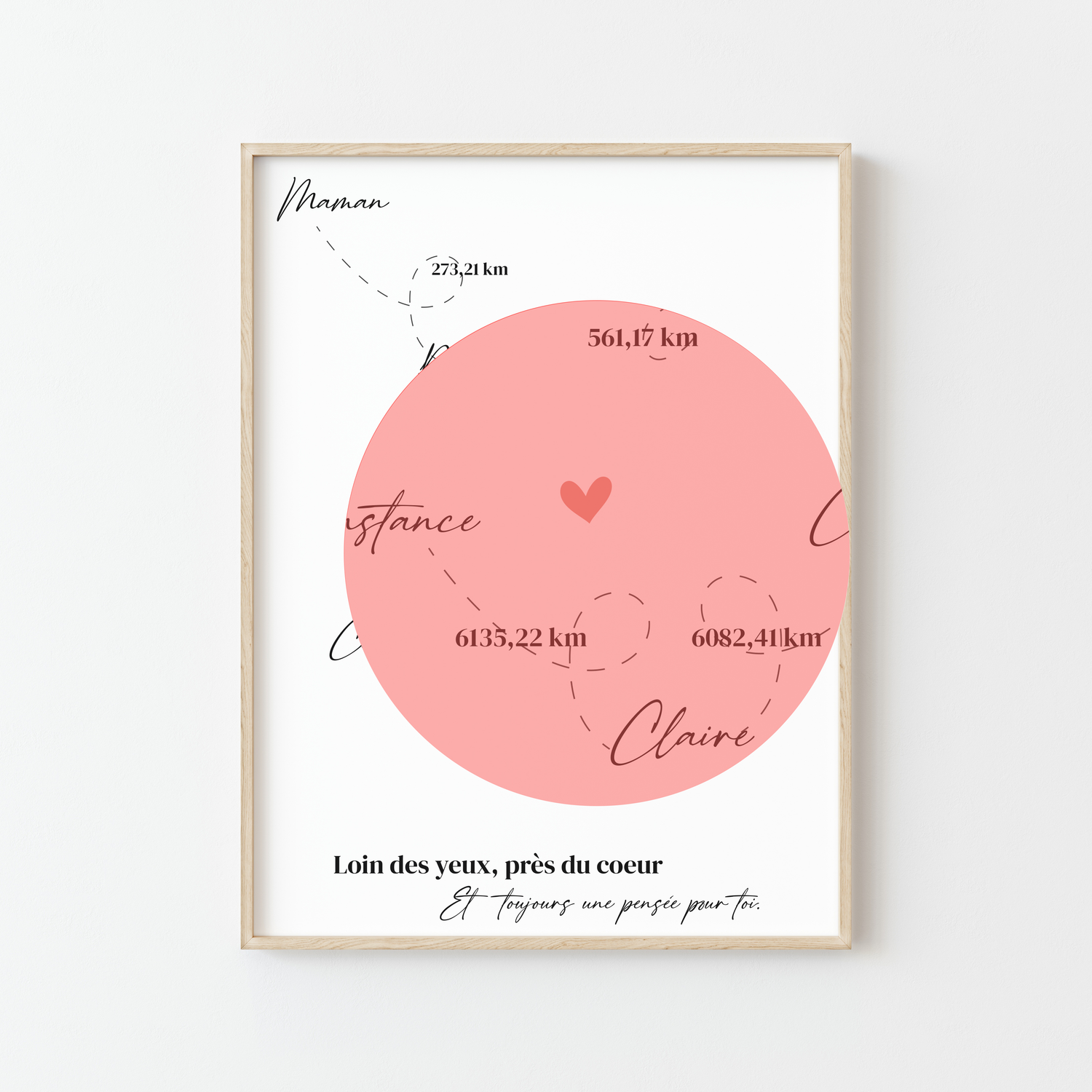 Personnalisable avec les prénoms de vos proches et les distances qui vous séparent, cette carte élégante célèbre les liens familiaux malgré l'éloignement.