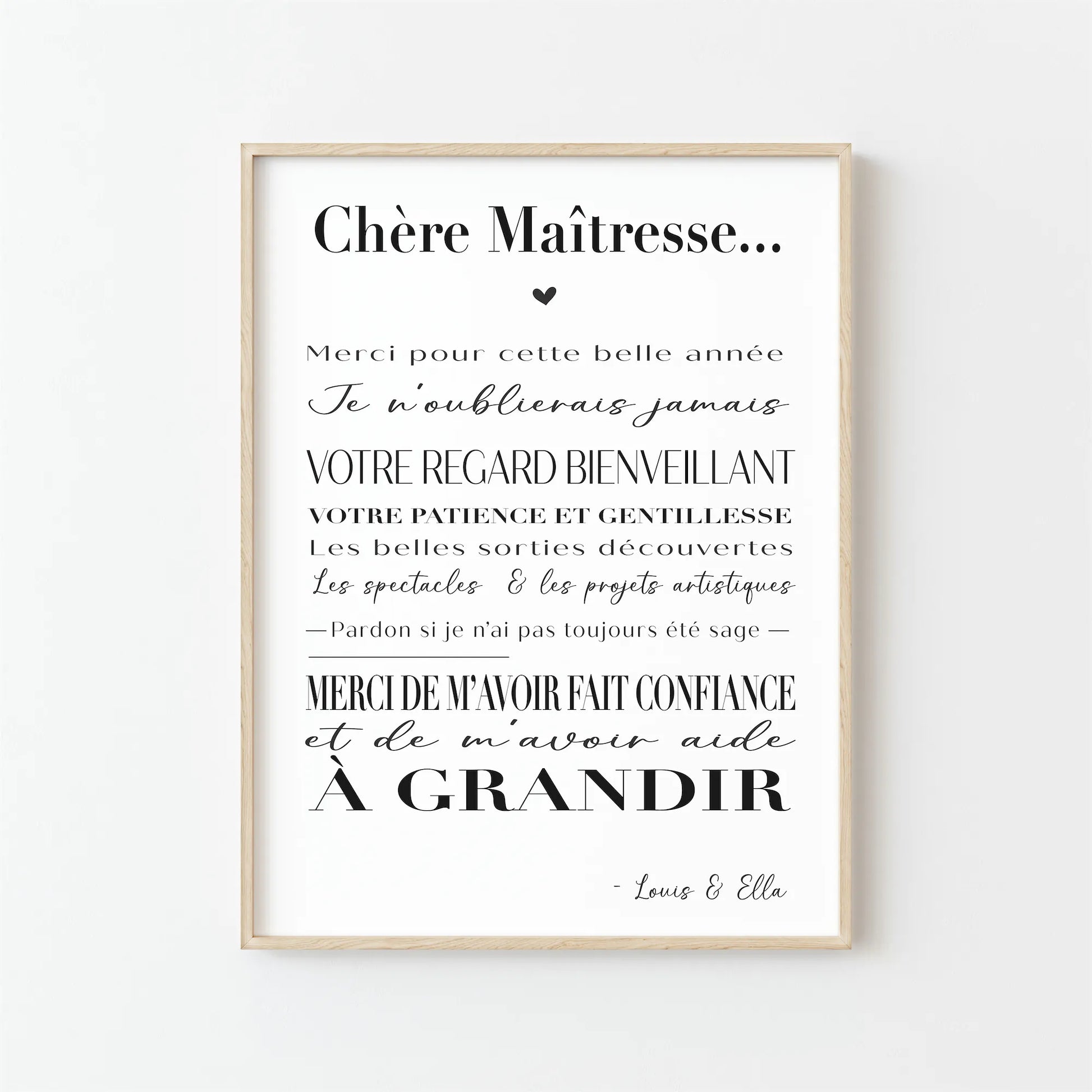 L'Affiche Maîtresse est imprimée sur du papier glossy de 350g de haute qualité pour garantir une durabilité et une clarté d'image exceptionnelles. Ajoutez une note personnelle en y intégrant les prénoms des enfants, pour créer un souvenir unique et mémorable de leur année scolaire.