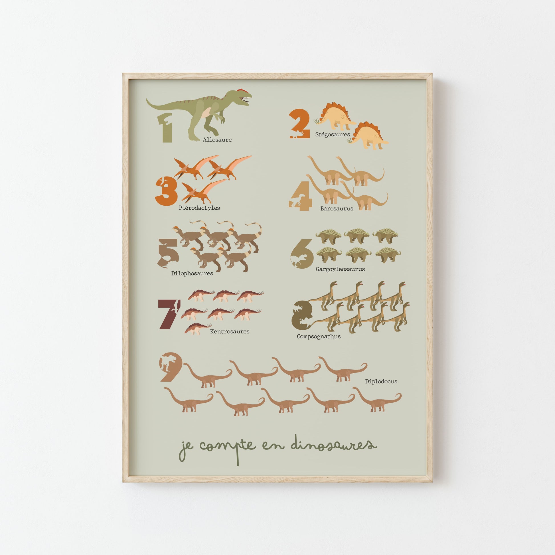 Faites découvrir à vos enfants les joies de l'apprentissage avec notre affiche "Je compte en dinosaures". Idéale pour les chambres d'enfants, cette affiche ludique et éducative les aidera à apprendre à compter tout en s'amusant avec leurs créatures préhistoriques préférées.