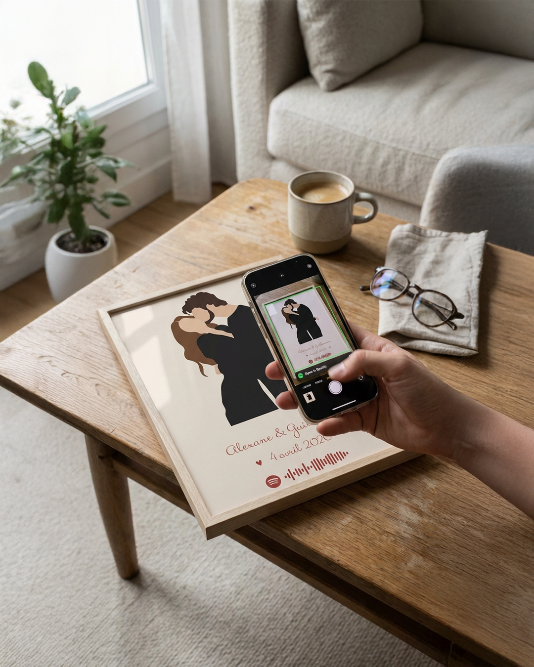 Une œuvre qui s'écoute (Option Spotify) : Vous avez une "chanson à vous" ? Celle de votre rencontre ou de votre ouverture de bal ? Choisissez l'option Spotify : nous intégrons discrètement le code de votre titre préféré. Scannez l'affiche avec votre téléphone, et la musique se lance. Magique.