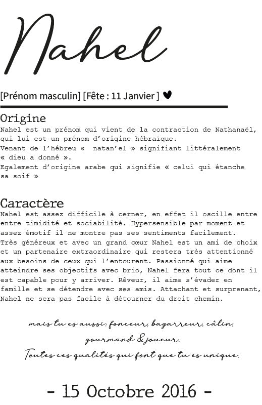 Personnalisez-la avec le prénom de l'enfant, sa date de naissance et ses traits de caractère, le tout sublimé par une mise en page élégante et intemporelle.