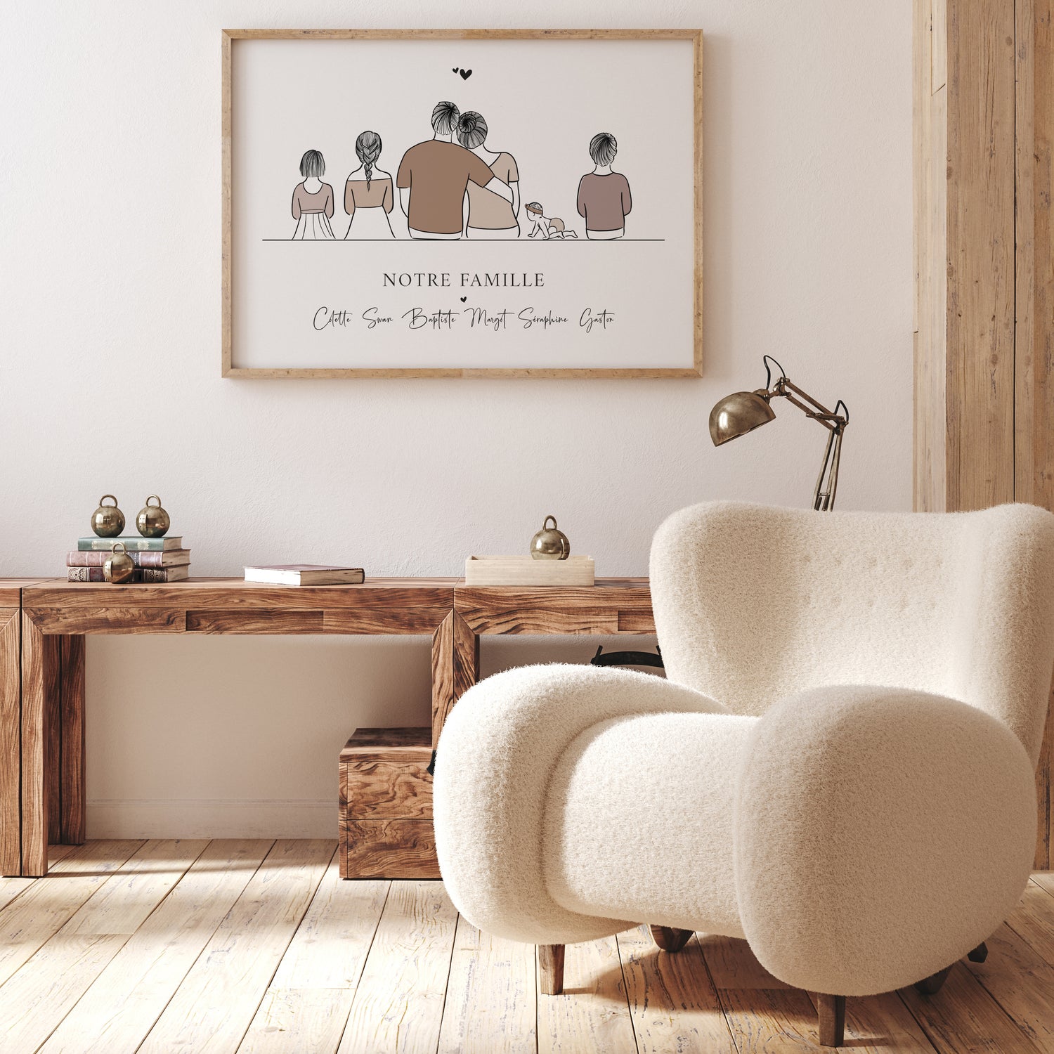Imaginez le portrait de votre famille immortalisé dans un style minimaliste élégant : jusqu'à 12 silhouettes de dos, vos prénoms calligraphiés avec amour, et un titre "Notre Famille" personnalisable.