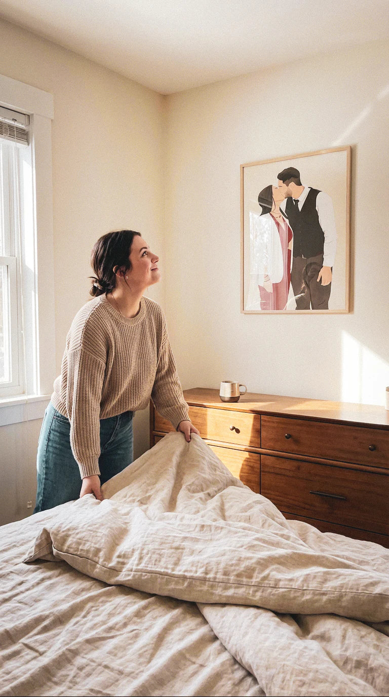 Notre illustratrice redessine votre cliché avec une sensibilité unique. Deux styles s'offrent à vous : le rendu réaliste, fidèle aux couleurs et aux expressions, ou le style harmonisé, où les teintes se fondent dans une palette coordonnée pour un effet plus pictural, presque onirique. Dans les deux cas, chaque trait est pensé pour capturer l'essence du moment — pas seulement les visages, mais l'émotion entre eux.